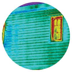 Thermal imaging reveals that the wall has turned a cool blue. Energy loss through studs and the top of the wall is no longer visible.